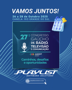 A Playlist Software Solutions estará no 27º Congresso Gaúcho de Rádio, Televisão e Comunicação, em Canela (RS), mostrando como tecnologia e simplicidade podem conectar estúdio, audiência e negócios. No estande, os visitantes poderão conhecer de perto soluções como o Playlist Digital, Aires Codec, Planner e Audie, além de orientações técnicas para migração e integração com vídeo e streaming. Uma oportunidade de viver, na prática, a inovação que transforma o rádio.